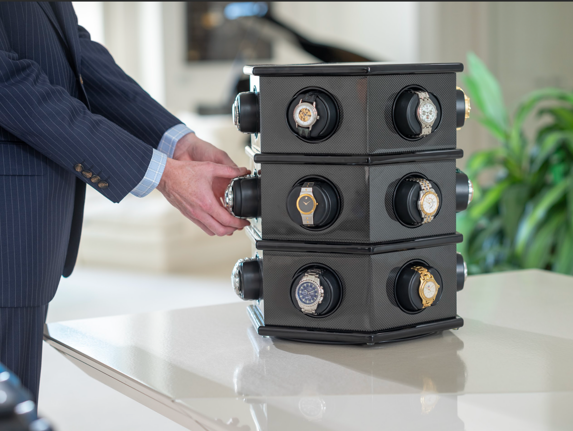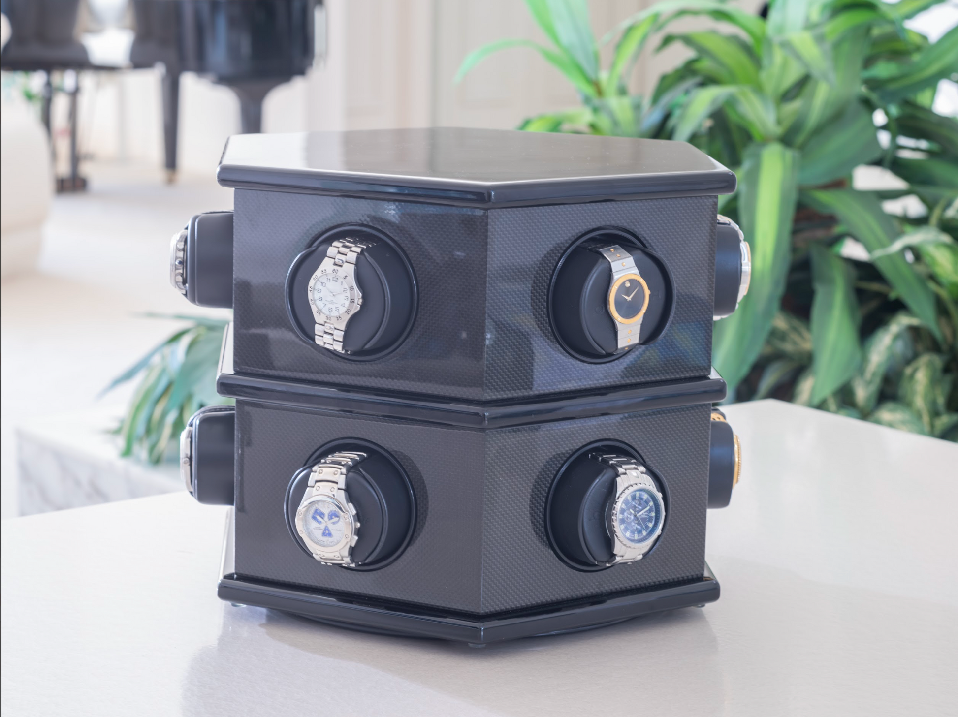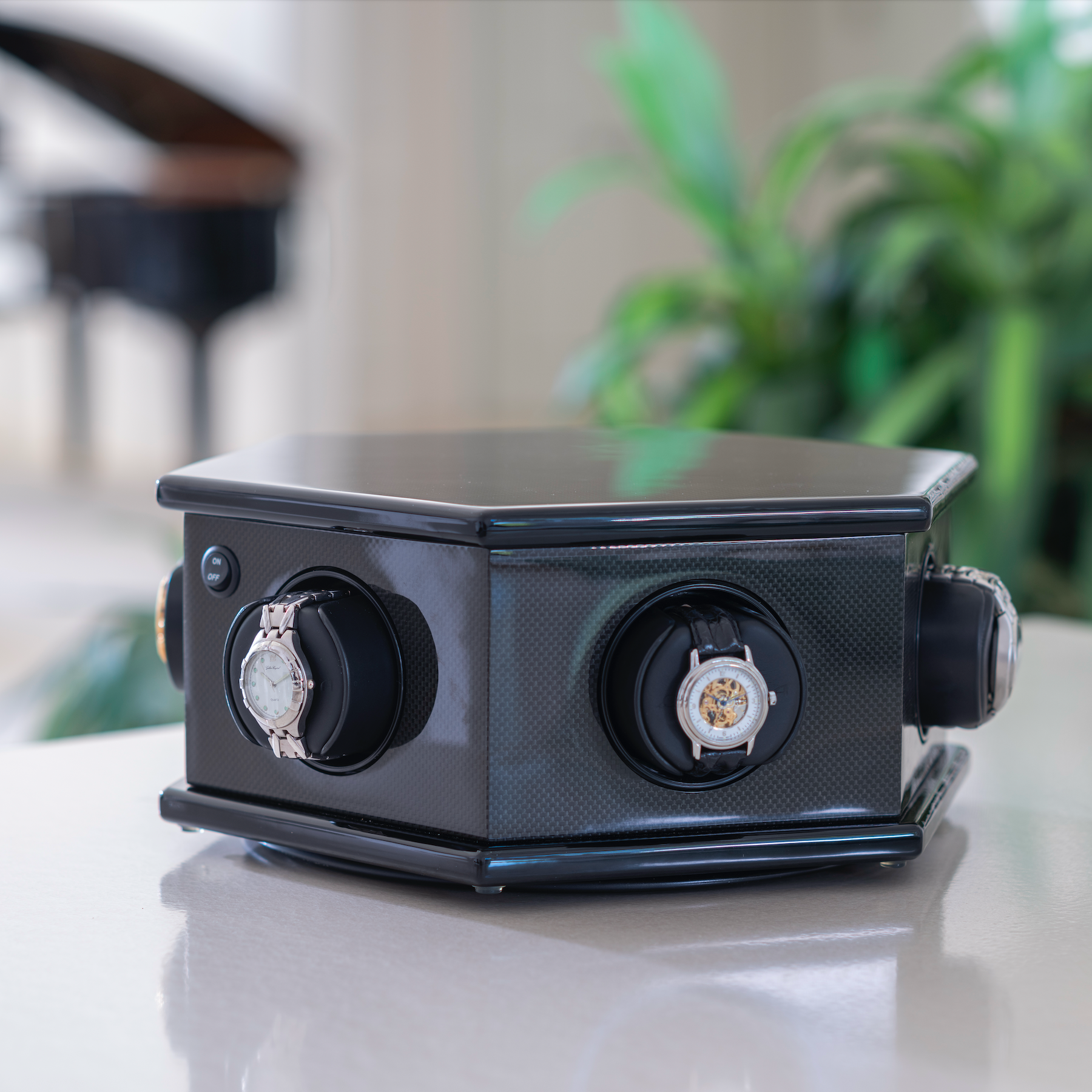 The CAROLO™ 6 sets a new standard in watch-winding innovation. Housed within a finely crafted hexagonal case, this six-watch winder is mounted on a precision ball-bearing swivel base, allowing smooth manual rotation for effortless access to every timepiece. Powered by six independent Orbita Lithium batteries, each Rotorwind drive head operates autonomously with its own programming switch—ensuring tailored care for every watch in your collection. Requiring only sixteen inches of depth, the CAROLO™ 6 is perfect for safes, cabinets, or shelves, combining compact design with uncompromising luxury. Carbon fiber panels lend a modern edge, making this winder as striking as it is functional.